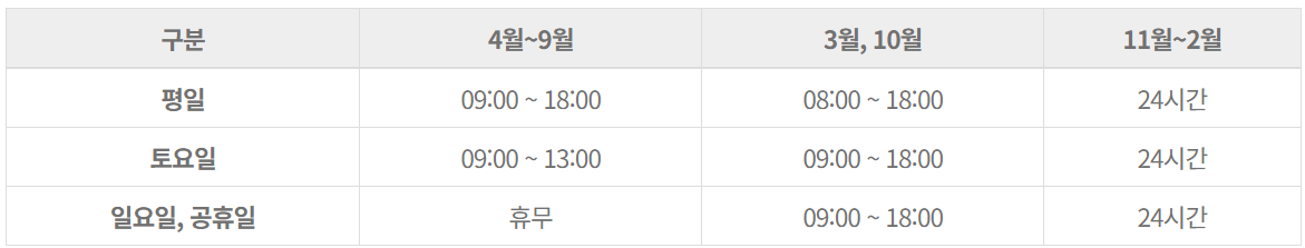 4월에서 9월까지 평일 09시부터 18시까지이며 토요일에는 13시까지 운영합니다. 일요일 공휴일에는 휴무인데요. 동절기 에는 특별 운영기간으로 일요일, 공휴일에도 운영을 합니다.