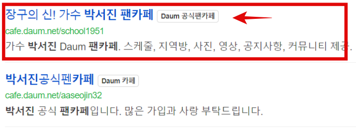 다음에서 '박서진 팬카페'로 검색하면 두가지가 나오는데요. 맨 처음에 나온 카페가 닻별 팬카페입니다.