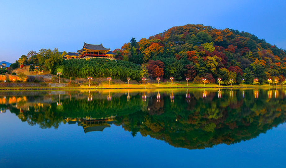 "남천강 굽이쳐서 영남루를 감돌고, 벽공에 걸린 달은 아랑각을 비추네"