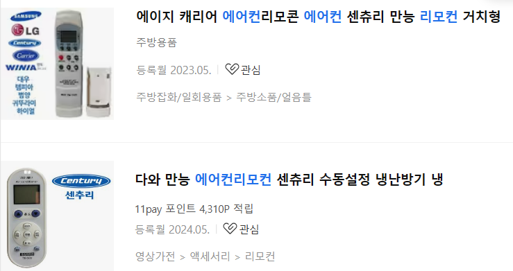 센추리 에어컨 전용 리모컨은 최저가 6720원부터 보이네요. 모든 브랜드에 다 사용할 수 있는 에어컨 만능 리모컨은 최저가 5820원부터 있네요.