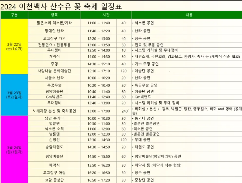 | 구례 산수유축제기간 입장료 주차장 주소 개화상황 (0) | 2024.03.11 |