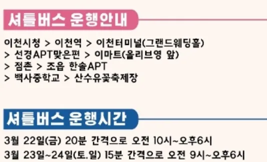 이천시청 - 이천역- 이천터미널- 선경apt 맞은편 - 이마트 - 점촌 - 조읍 한솔apt - 백사중학교 - 산수유꽃축제장