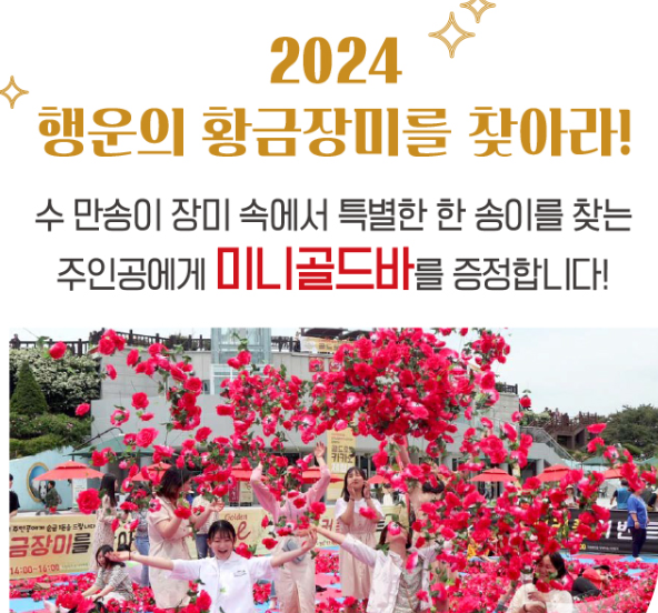 곡성 섬진강기차마을의 장미공원에서 세계 명품 장미 1,004종을 만나볼 수 있어요. 다양한 색상과 형태의 장미가 아름답게 펼쳐져 있는데요. 이 수 만송이 장미 속에서 특별한 한 송이를 찾는 분에게 미니 골드바를 주는 '행운의 황금장미를 찾아라' 이벤트도 진행해요.