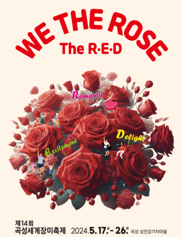 2024 곡성세계장미축제는 "WE THE ROSE(위 더 로즈), 우리 모두가 아름다운 장미"라는 주제로 열리는데요, "THE RED(더 레드)"라는 콘셉트로 기획되었어요. 이 콘셉트는 로맨틱함, 흥미진진함, 즐거움을 축제에 담아내고 빨간색의 강렬함을 연출하는 것이 목표라고 하네요.