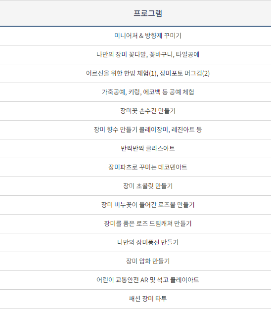 여러가지 체험프로그램도 마련되었는데요. 공예 작업 부스에서는 다양한 소품을 직접 만들어볼 수 있답니다. 장미 꽃다발, 꽃바구니 만들기, 장미포토 머그컵, 가죽공예, 장미꽃 손수건, 장미 초콜릿 만들기 등 다양한 체험 행사가 있으니 돌아보시면서 한번 쯤 참여해보는 것도 좋을 것 같아요.